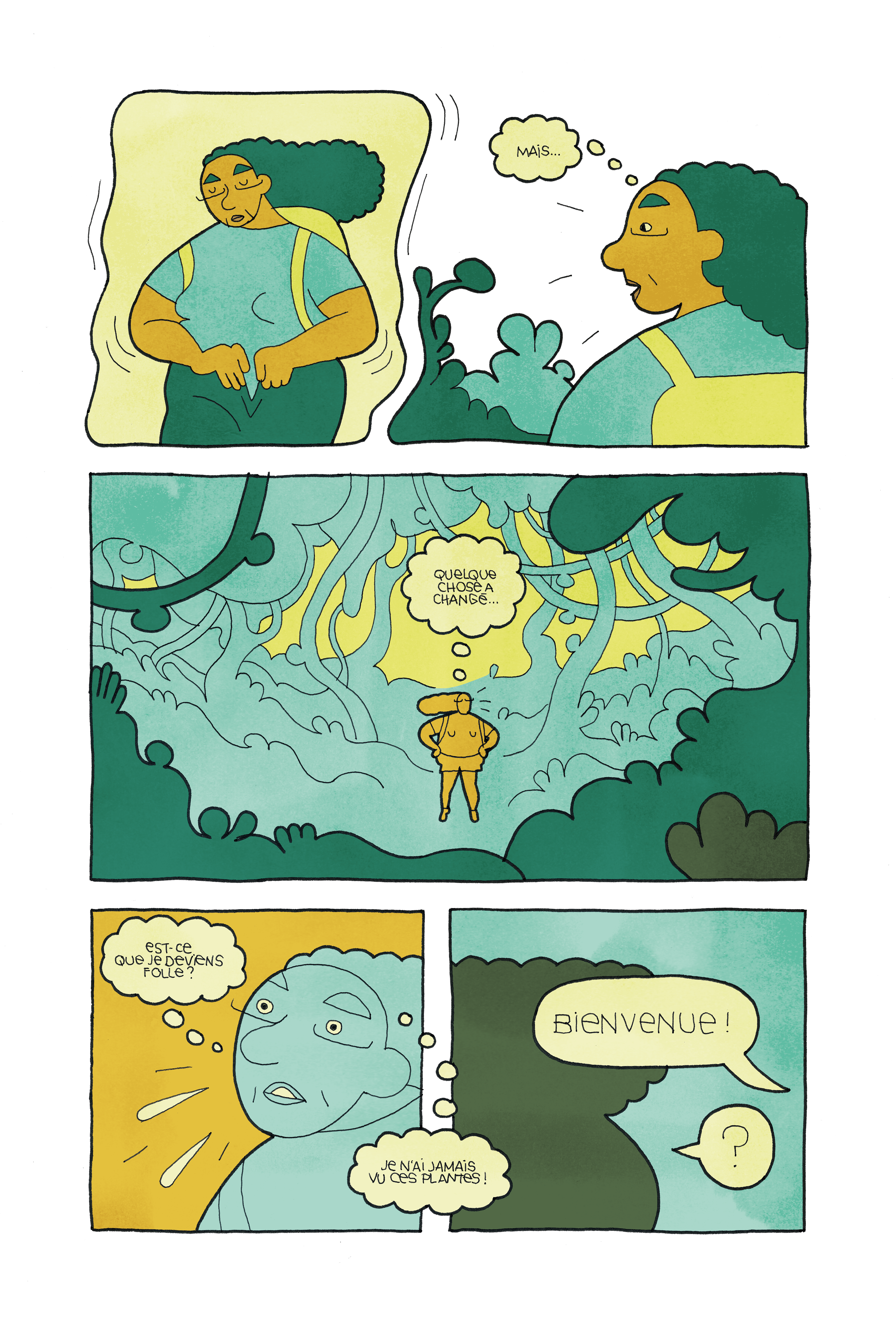 Extrait d’une BD de 7 pages pour le fanzine Lichen édité par l’association Breson (à paraître). En s’éloignant de son groupe de botanique pour aller faire pipi, une femme découvre un monde étrange...